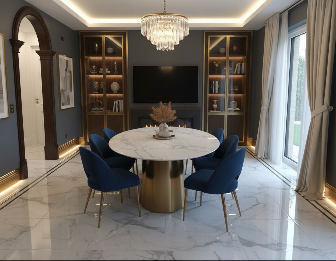 After (Luxury style): Oval marble dining table, upholstered dining chairs, dressed chandelier, sideboard with art, window dressing. An empty room that looked unsaleable now reads as aspirational.